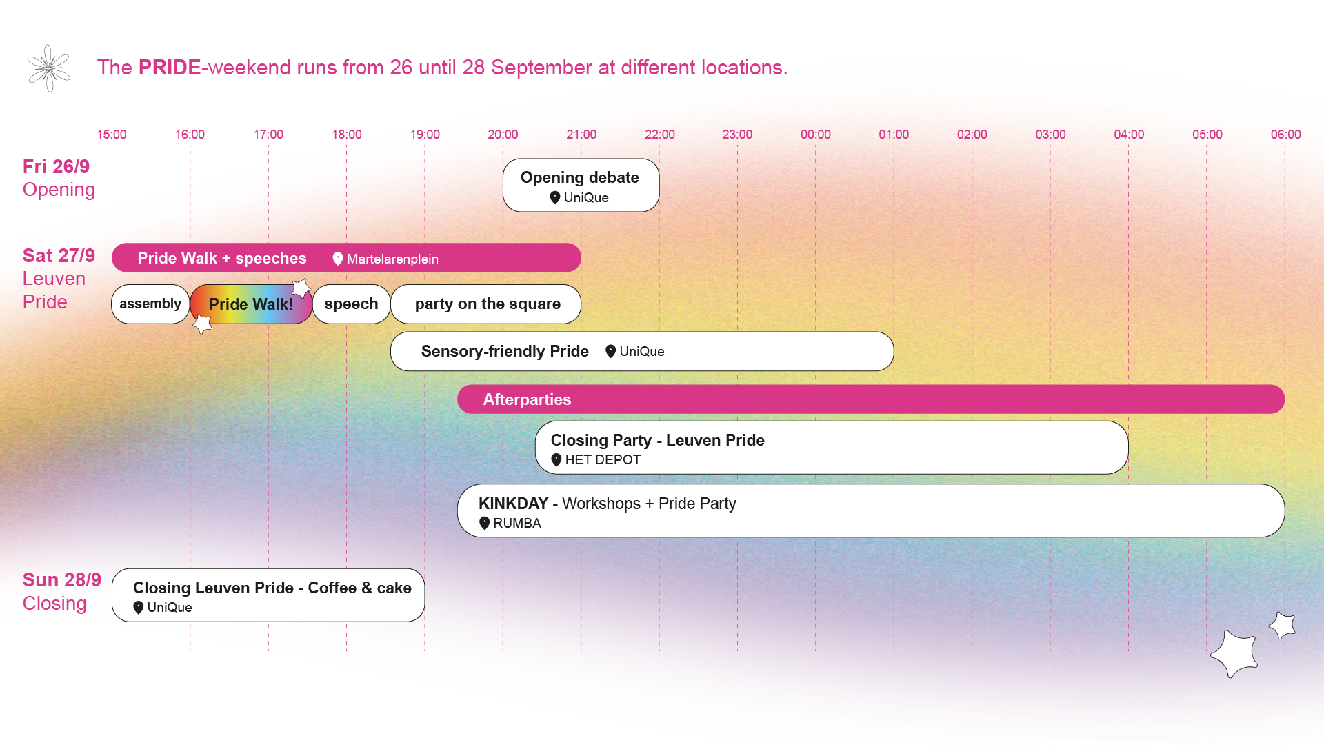 From parade to performance, workshops, Pride Hubs and afterparties: Leuven will be bursting with queer fun!
