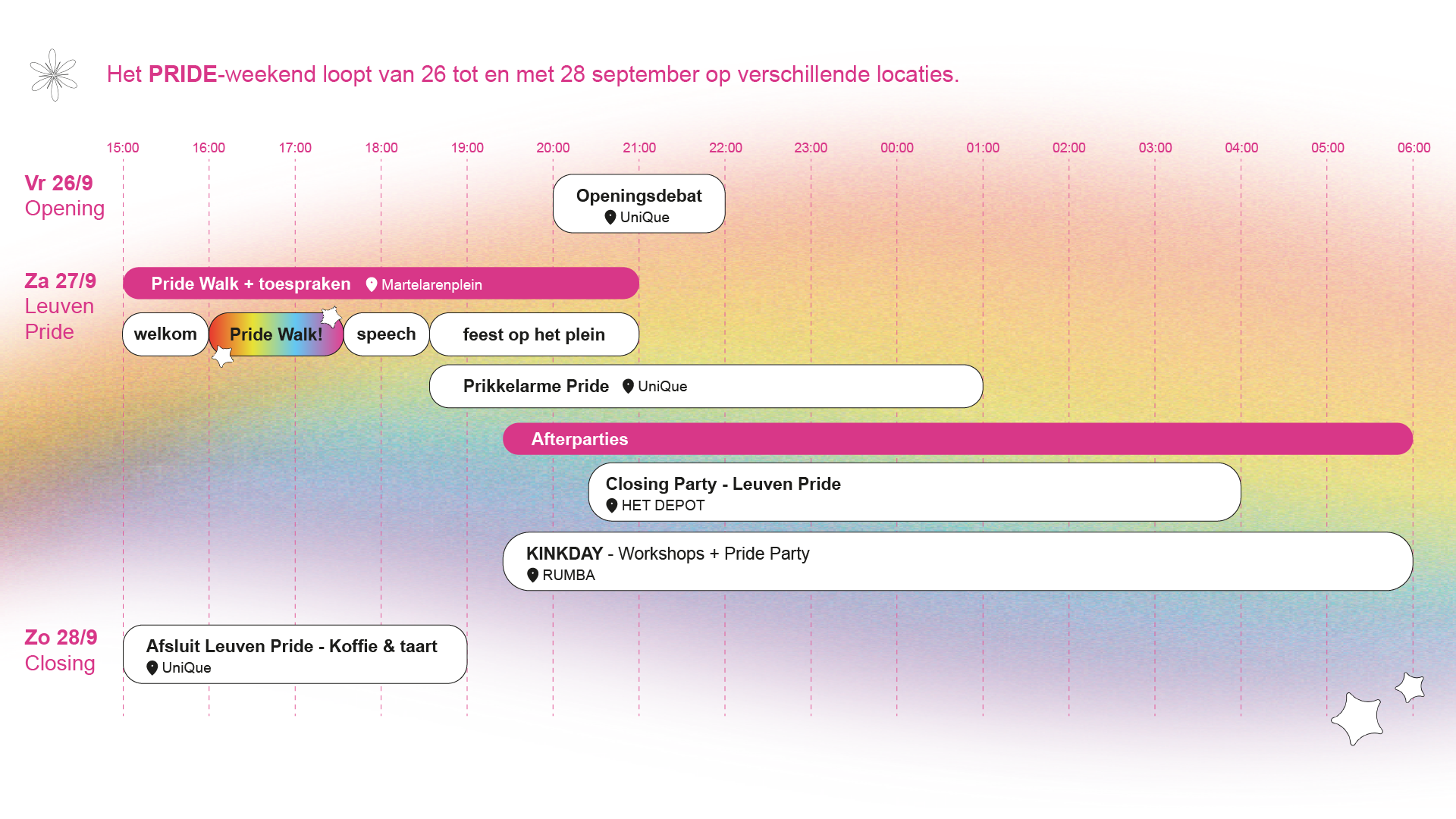Van parade tot optredens, workshops, Pride Hubs en afterparty's: Leuven bruist van queer plezier! Ontdek waar jij kan meedoen, luisteren, dansen of gewoon jezelf zijn en ontdek nog zoveel meer tijdens het Prideweekend.
